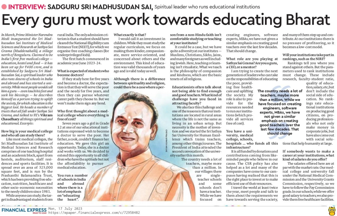 In March, Prime Minister Narendra Modi inaugurated the Sri Madhusudan Sai Institute of Medical Sciences and Research at Sathya Sai Grama (Muddenahalli), a village north of Bengaluru. Claimed to be India’s first free medical college — education, hostel and food — it has been set up for Rs 400 crore, and is established by Sadguru Sri Madhusudan Sai, a spiritual leader who also runs dozens of schools in India and abroad and has started a university. While most people would call him a guru — even touch his feet and seek his blessings — he describes himself as a person trying to uplift the society, for which education is the biggest tool. He heads a number of trusts that all fall under Sathya Sai Grama, and talked to FE’s Vikram Chaudhary all things spiritual and educational. Excerpts: