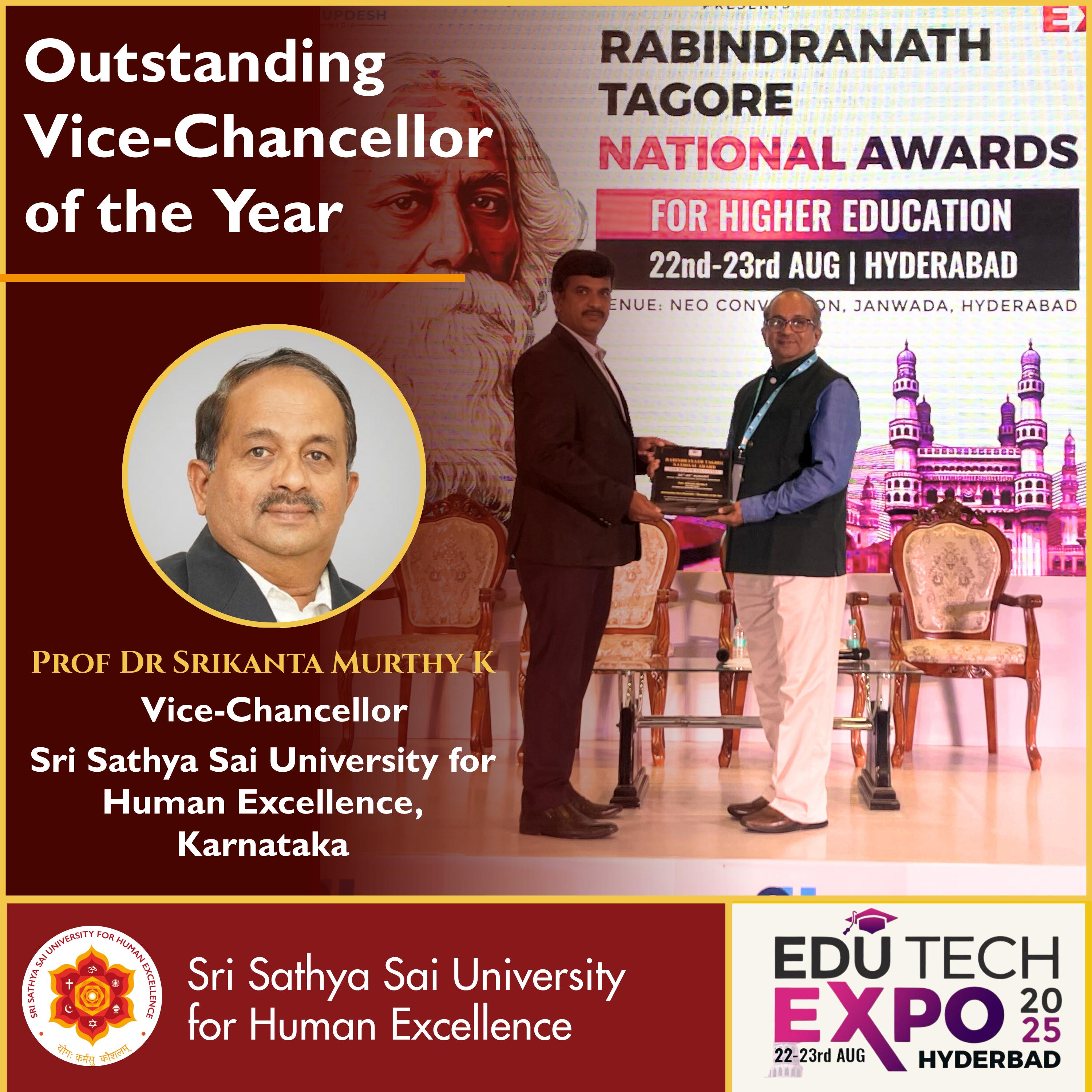 We are humbled to share that Prof Dr Srikanta Murthy K, the esteemed Vice-Chancellor of Sri Sathya Sai University for Human Excellence, Karnataka, is honored with the Rabindranath Tagore National Award for Higher Education in the category of Outstanding Vice-Chancellor of the Year.