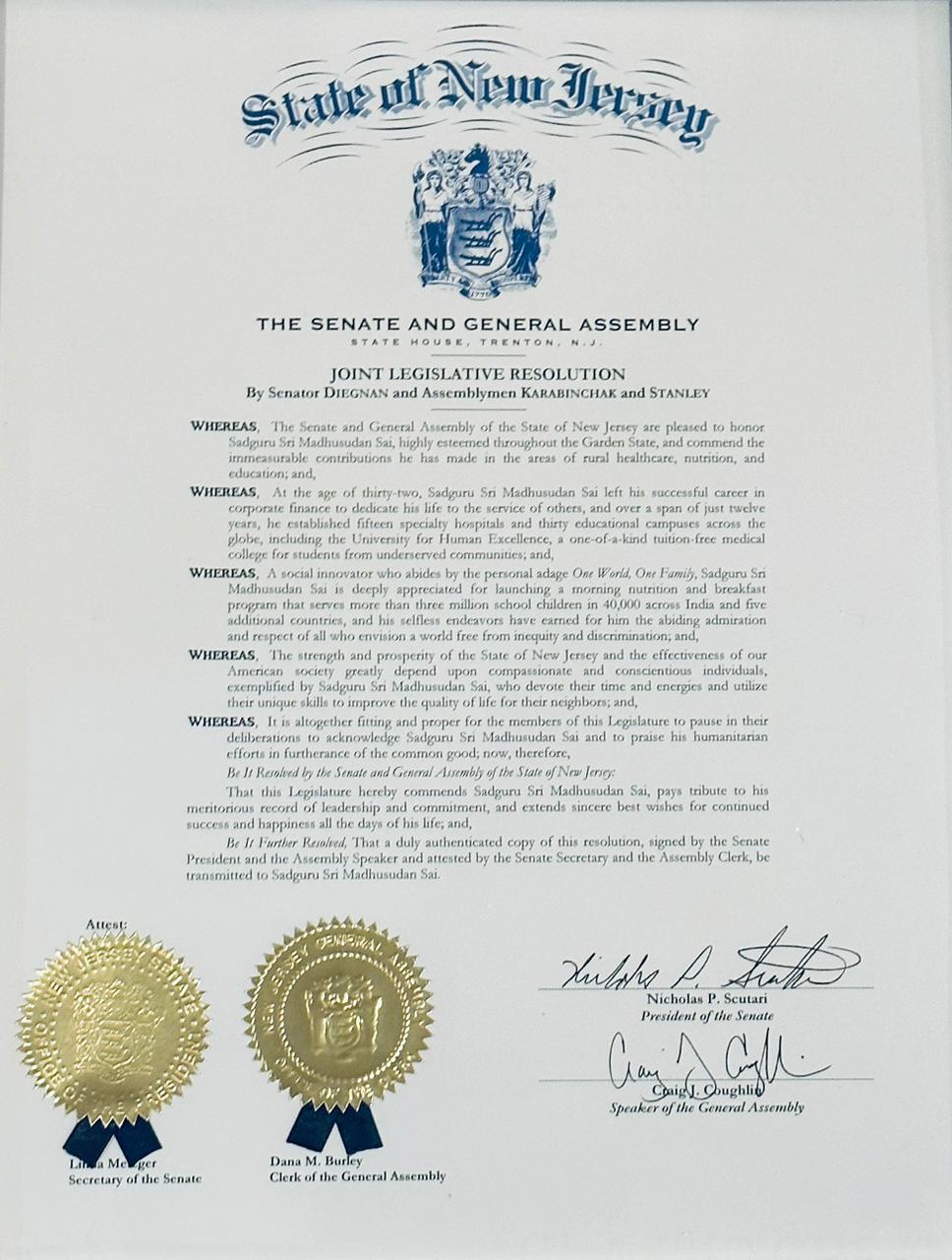 The first, a Joint Legislative Resolution by Senator Patrick Diegnan and Assemblymen Robert Karabinchak and Sterley Stanley, representing Senate and General Assembly of the State of New Jersey, recognising his incredible work.