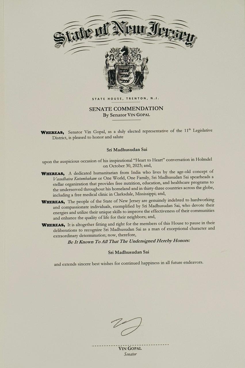 Sri Madhusudan Sai, on his East Coast visit to the USA, received two prestigious recognitions on Oct 30 and 31, 2023.