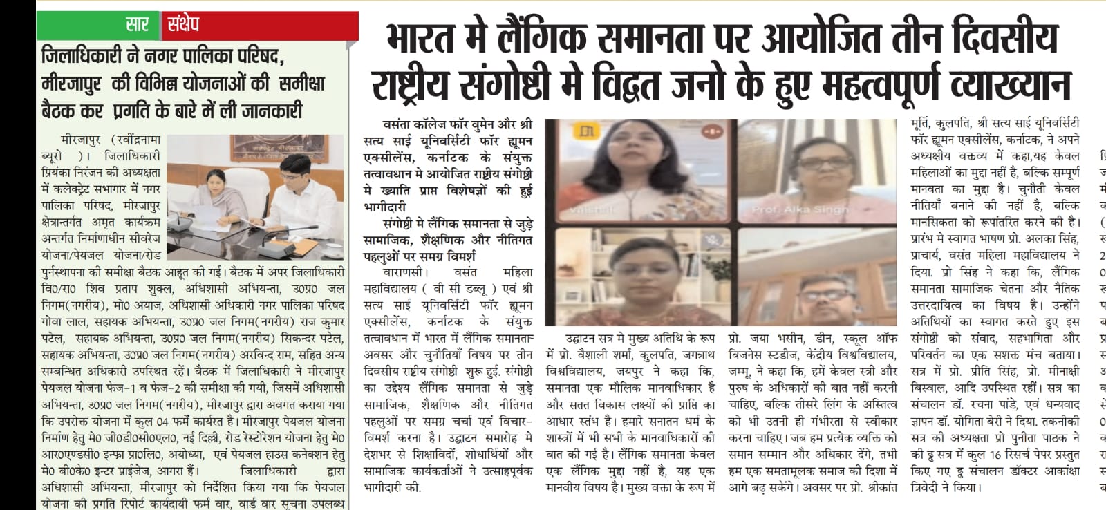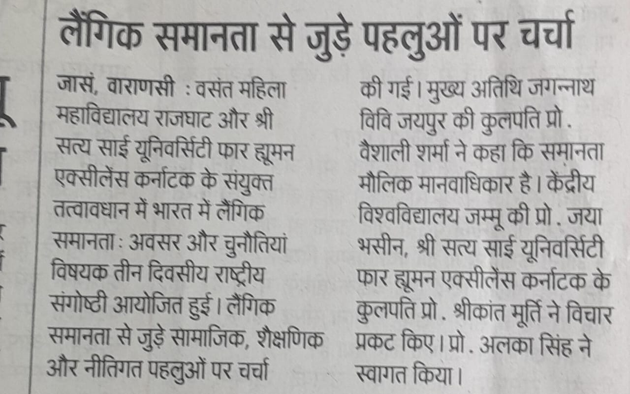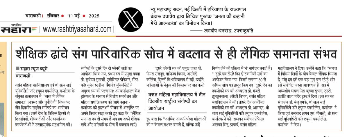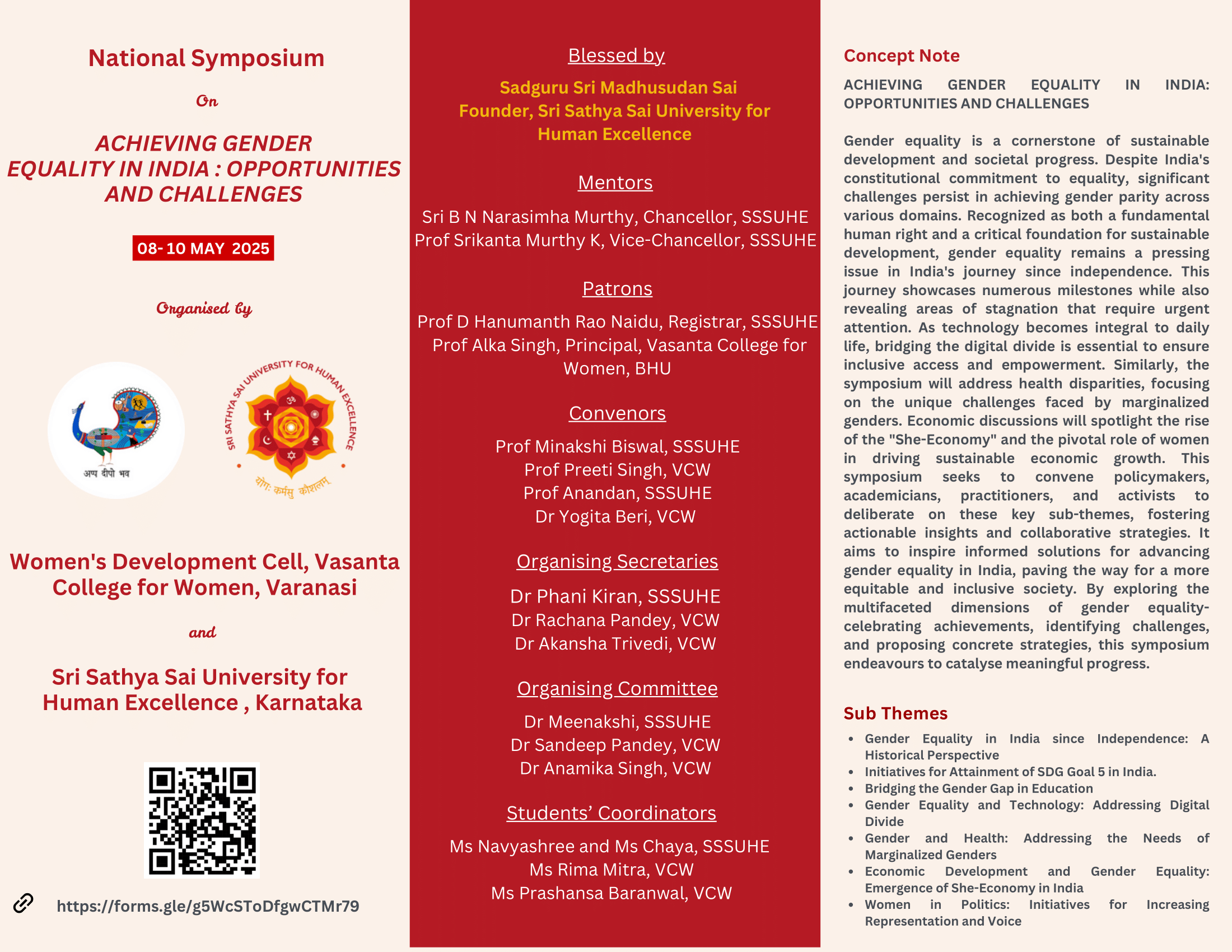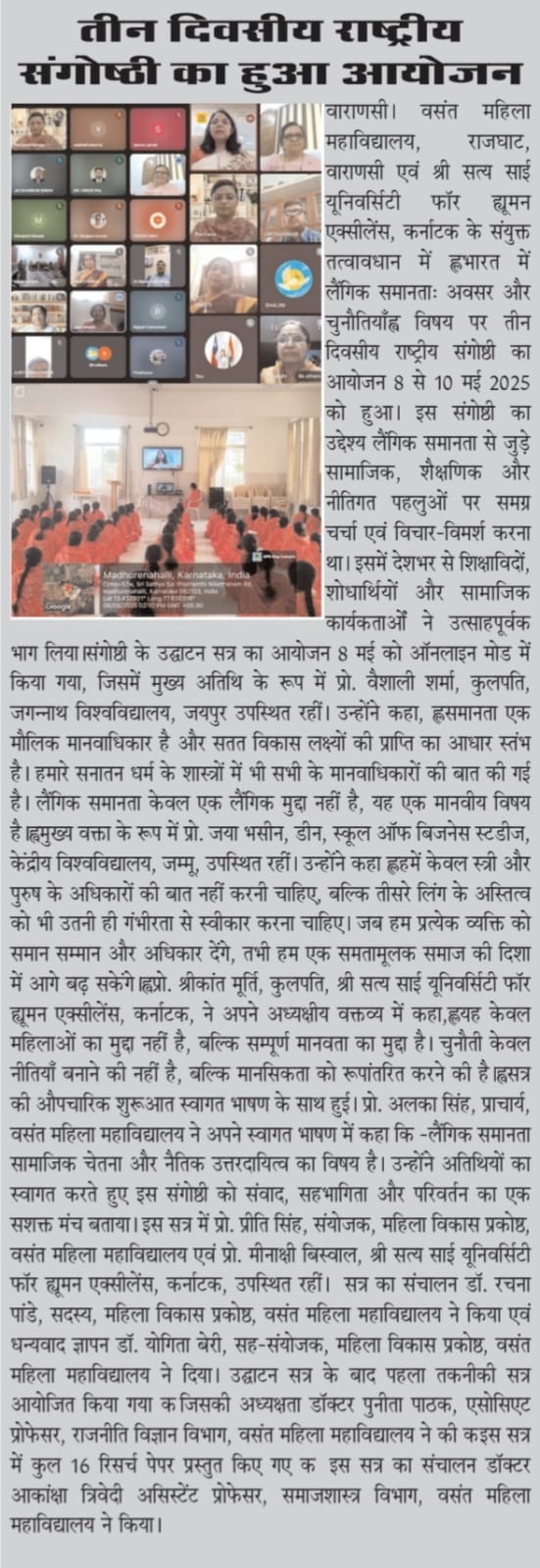 A three-day National Symposium on “Achieving Gender Equality in India: Opportunities and Challenges” was successfully organized from May 8 to 10, 2025, by the Women’s Development Cell of Vasanta College for Women, Varanasi, in collaboration with Sri Sathya Sai University for Human Excellence (SSSUHE), Karnataka.