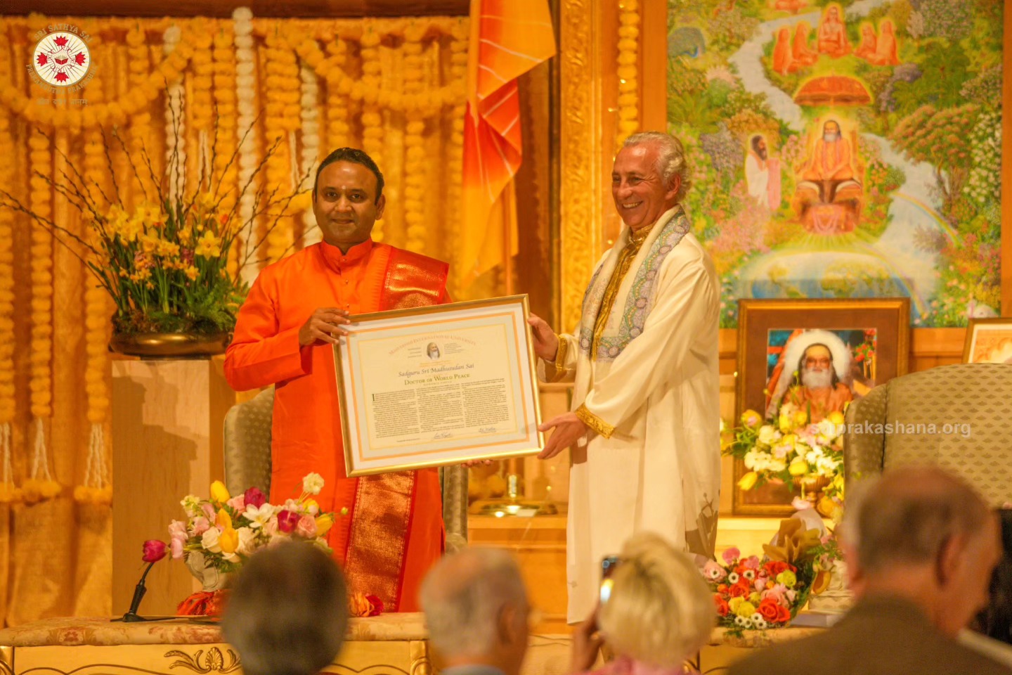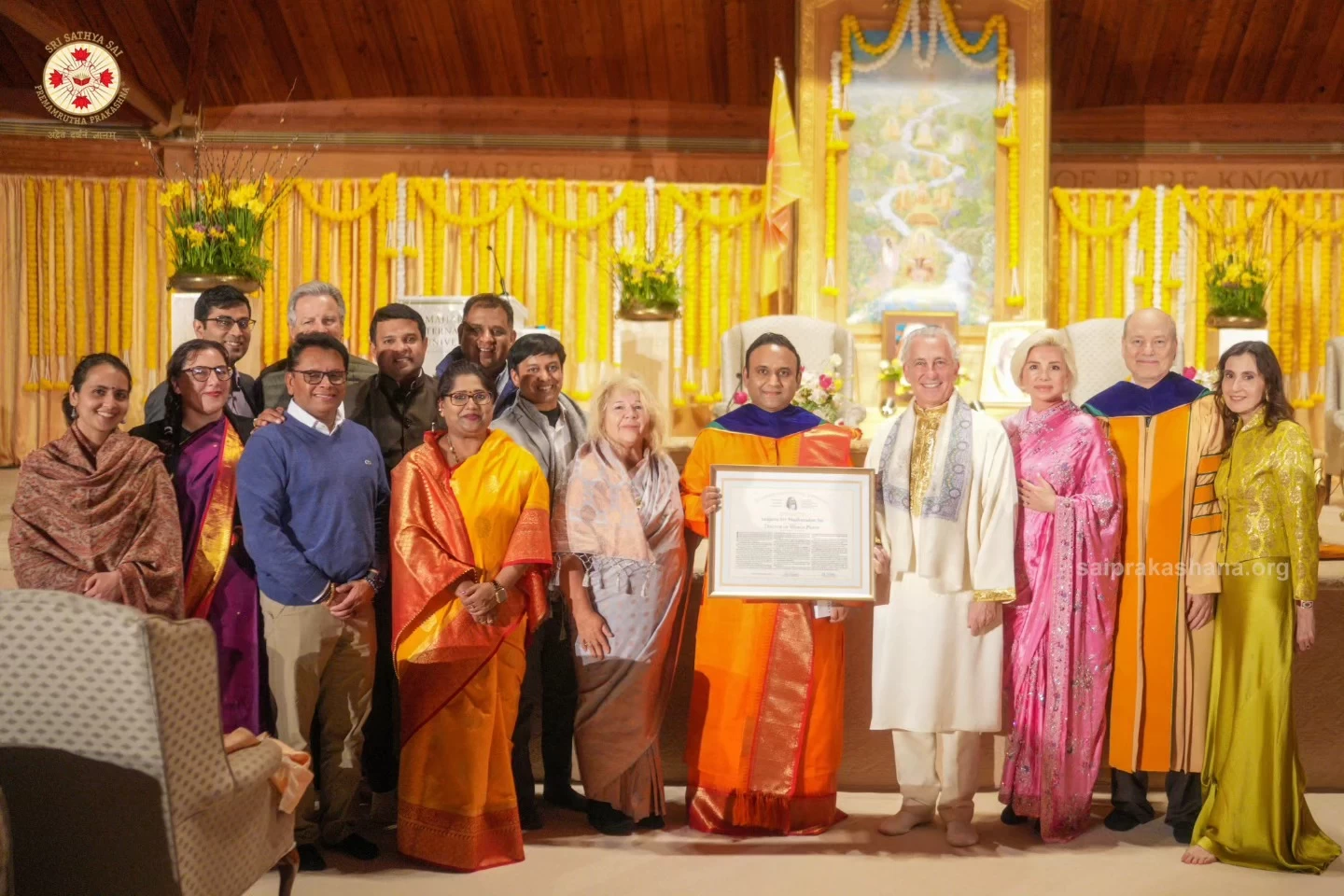Sri Madhusudan Sai was bestowed with an Honorary Doctorate of World Peace by the Maharishi International University on 3rd April 2024 at the Golden Dome, Maharishi International University, Fairfield, Iowa. Presented by Tony Nader, esteemed leader of the Transcendental Meditation movement, this honour celebrates Sri Madhusudan Sai's lifelong commitment to serving the global community and fostering a happy, healthy, peaceful, and enlightened world.