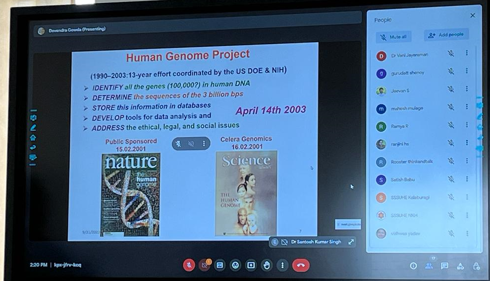 The seminar was organized to educate Life Science students at Sri Sathya Sai University for Human Excellence about the latest advances in Human Genome Research. B.Sc. students from the Kalburgi campus and M.Sc. students from the Nallakadirenahalli campus joined the talk online, while M.Sc. Life Science students from the Muddenahalli campus attended offline. Students enrolled in the Life Science doctoral program also attended the seminar online. Dr. S.A. Vasudev, the Director of the university's Innovation and Incubation Centre, and Professor Shambhunath Bose were also present in person as special guests.
