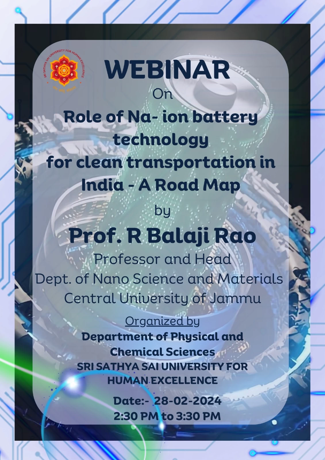 We are delighted to invite you to a webinar on the "Role of Na-Ion Battery Technology for Clean Transportation in India - A Road Map," organized by the Department of Physical and Chemical Sciences at Sri Sathya Sai University for Human Excellence (SSSUHE).