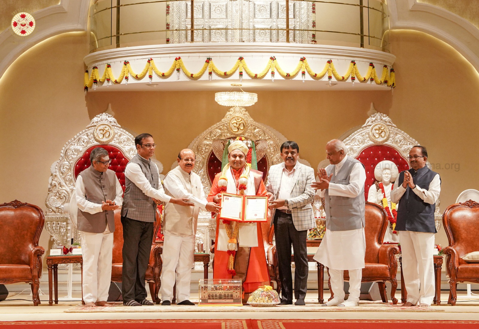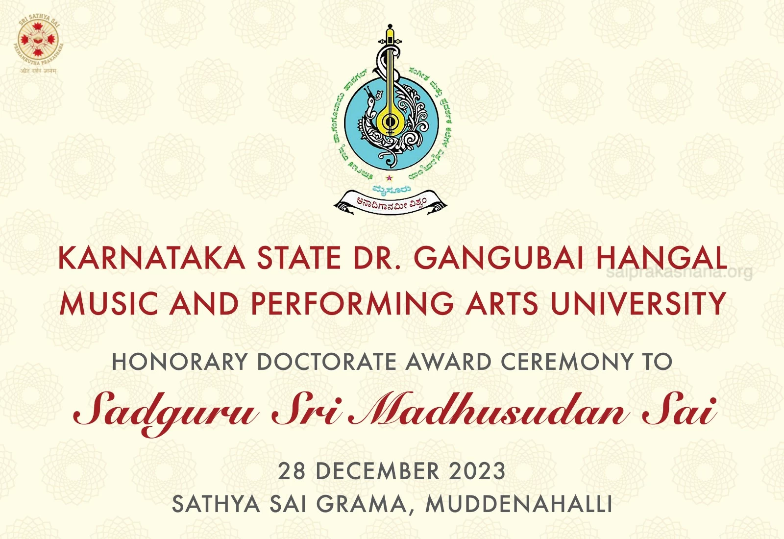 The Honorary Doctorate was personally conferred upon Sadguru Sri Madhusudan Sai at Sathya Sai Grama on 28 December 2023 during the Fifth Annual Convocation of Karnataka State Dr. Gangubai Hangal Music and Performing Arts University. The convocation took place on 18 October 2023 in Mysore. This recognition is a tribute to Sadguru's substantial contributions to Indian classical music and his global humanitarian service projects, which have had a positive impact on millions of lives.