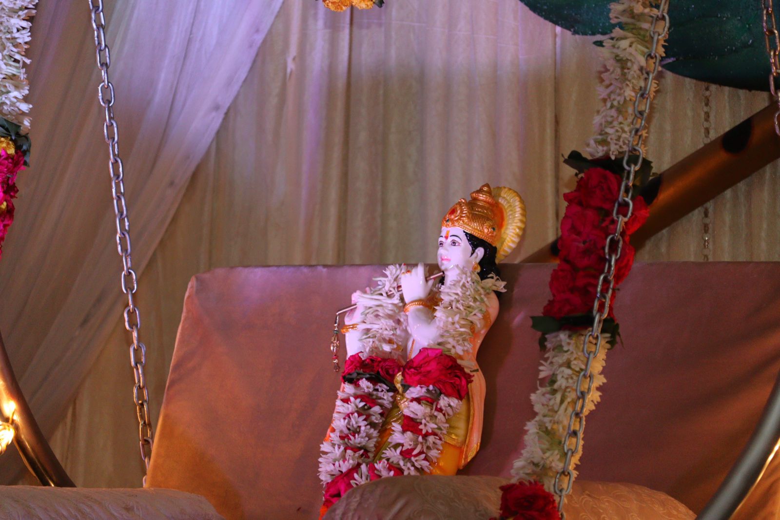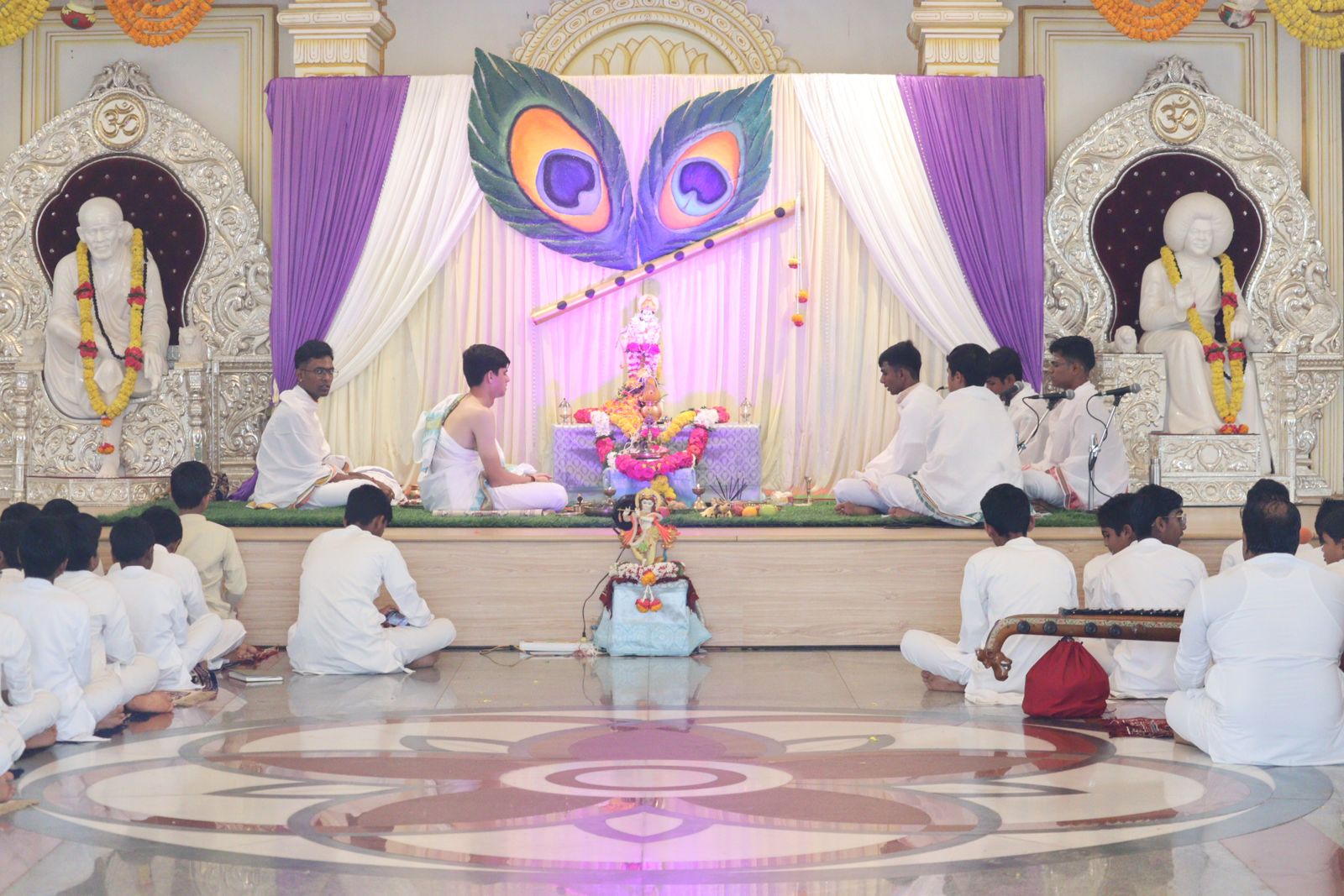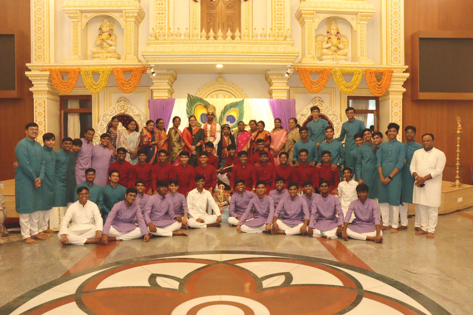 As the procession reached the Pentagon Prayer Hall, the entire hall resonated with divine energy, filling the hearts of the devotees with joy and reverence. In the Prayer Hall, the Krishna Puja continued with an Astavadhana Seva, a special Vedic ritual performed by the Department of Vedic Studies. The seva included the recitation of sacred stotrams (hymns), melodious songs, and a graceful dance recital by a student, all offered as a tribute to Lord Krishna.