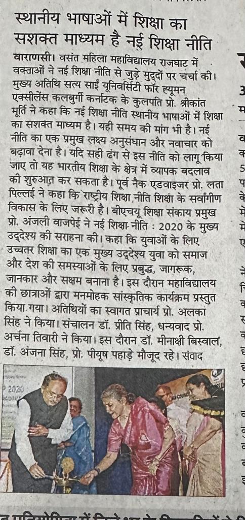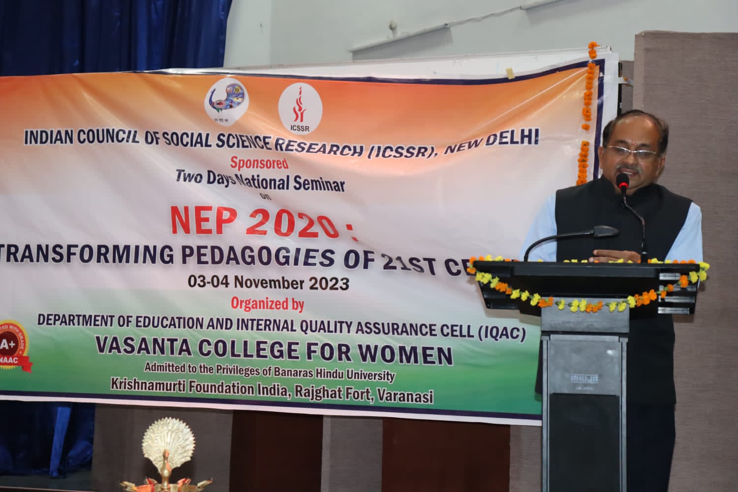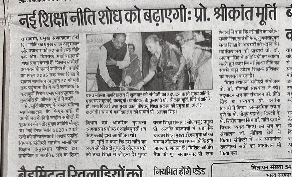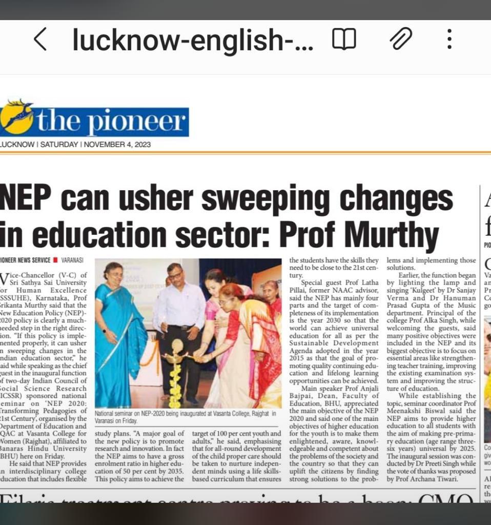 Indian Council of Social Science Research (ICSSR)-sponsored two-day national seminar on "NEP 2020: Transforming Pedagogies of 21st Century" on November 3 and 4, 2023, organised by the Department of Education and IQAC, Vasanta College for Women, Rajghat, Varanasi.