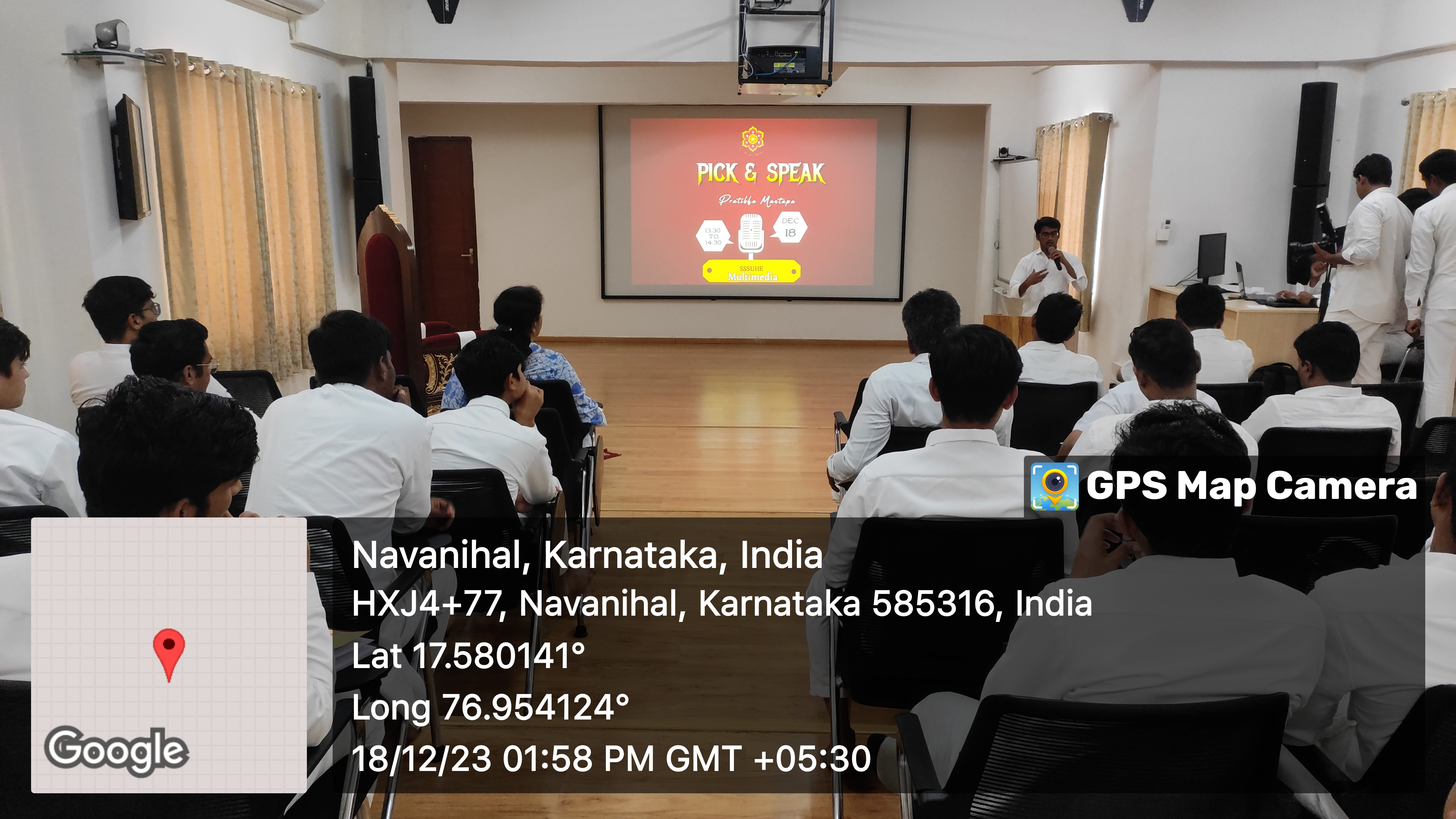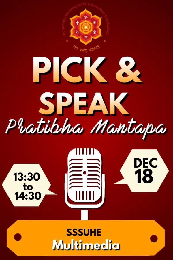 The Pratibha Mantapa "Pick and Speak" event, held on December 18, 2023, at the Multimedia Room, brought together participants from three teams: Sai Charan, Sai Arpan, and Sai Samarpan. The event aimed to showcase spontaneous speaking skills through the Pick and Speak activity.