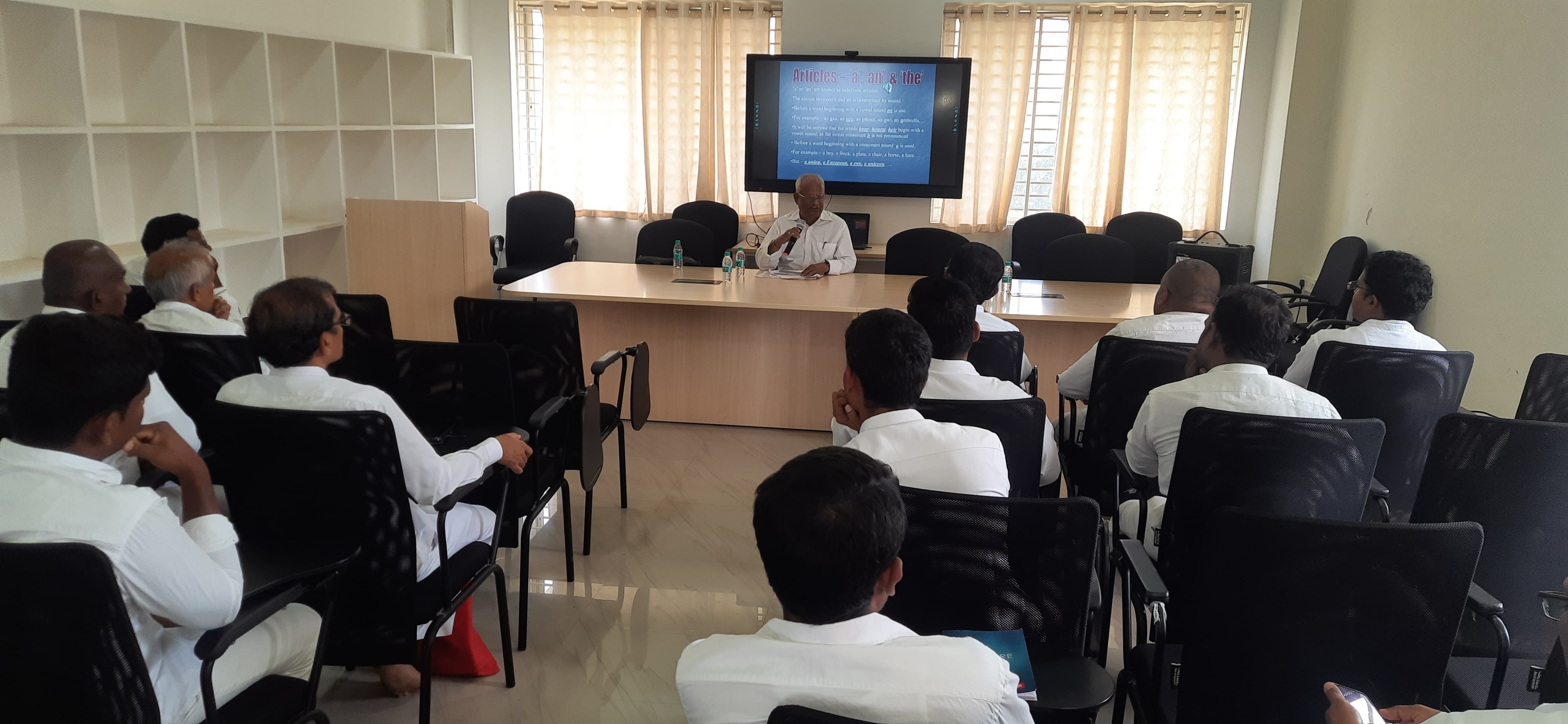 Professor B. N. Balajee, affectionately known as "Shakespearewala" and expert on spoken English. His insights and guidance were invaluable to the Assistant Professors of Muddenahalli campus. He shared some practical tips on grammar and usage that can be easily applied in everyday conversations. He also emphasized the importance of continuous learning and improvement.