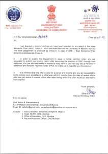 We are delighted to inform that our esteemed Honorary Professor, belonging to the distinguished Department of Life Sciences at SSSUHE, Professor N. B. Ramachandra, has been honoured with the prestigious Raja Ramanna Chair by the Department of Atomic Energy, Government of India. This prestigious appointment will allow him to continue his valuable research endeavours for a period of five years, accompanied by a dedicated research staff and an appropriate honorarium.
