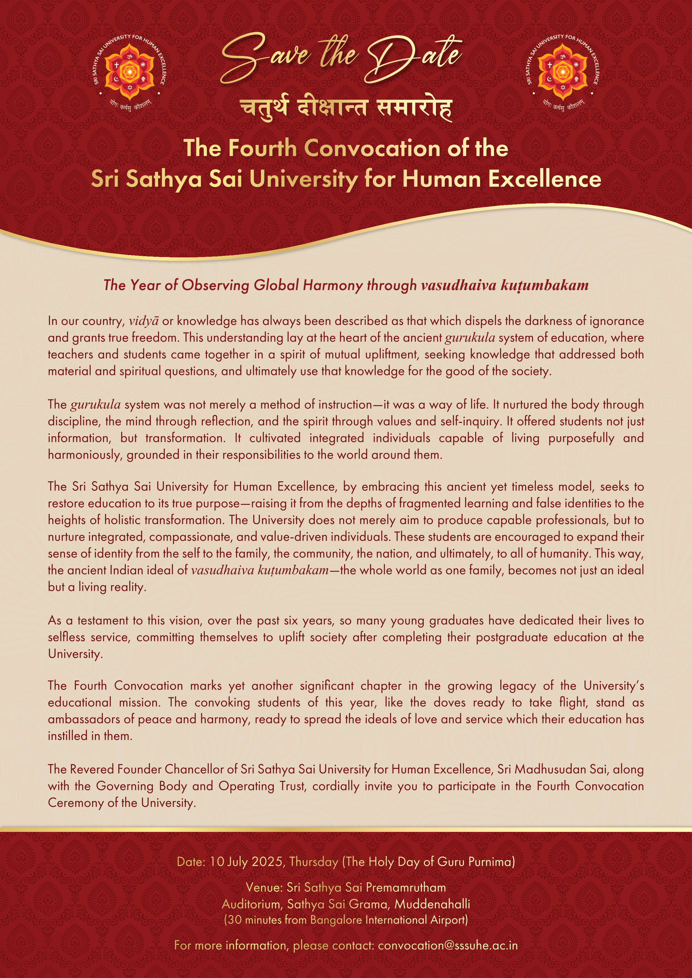 This year, we reflect on the transformative power of education rooted in values, character, and service. At Sri Sathya Sai University, education is not merely a means to a career, but a path to self-realisation and societal upliftment.
