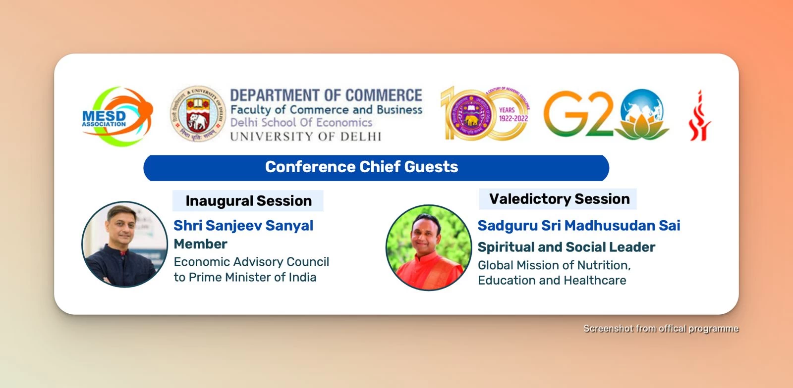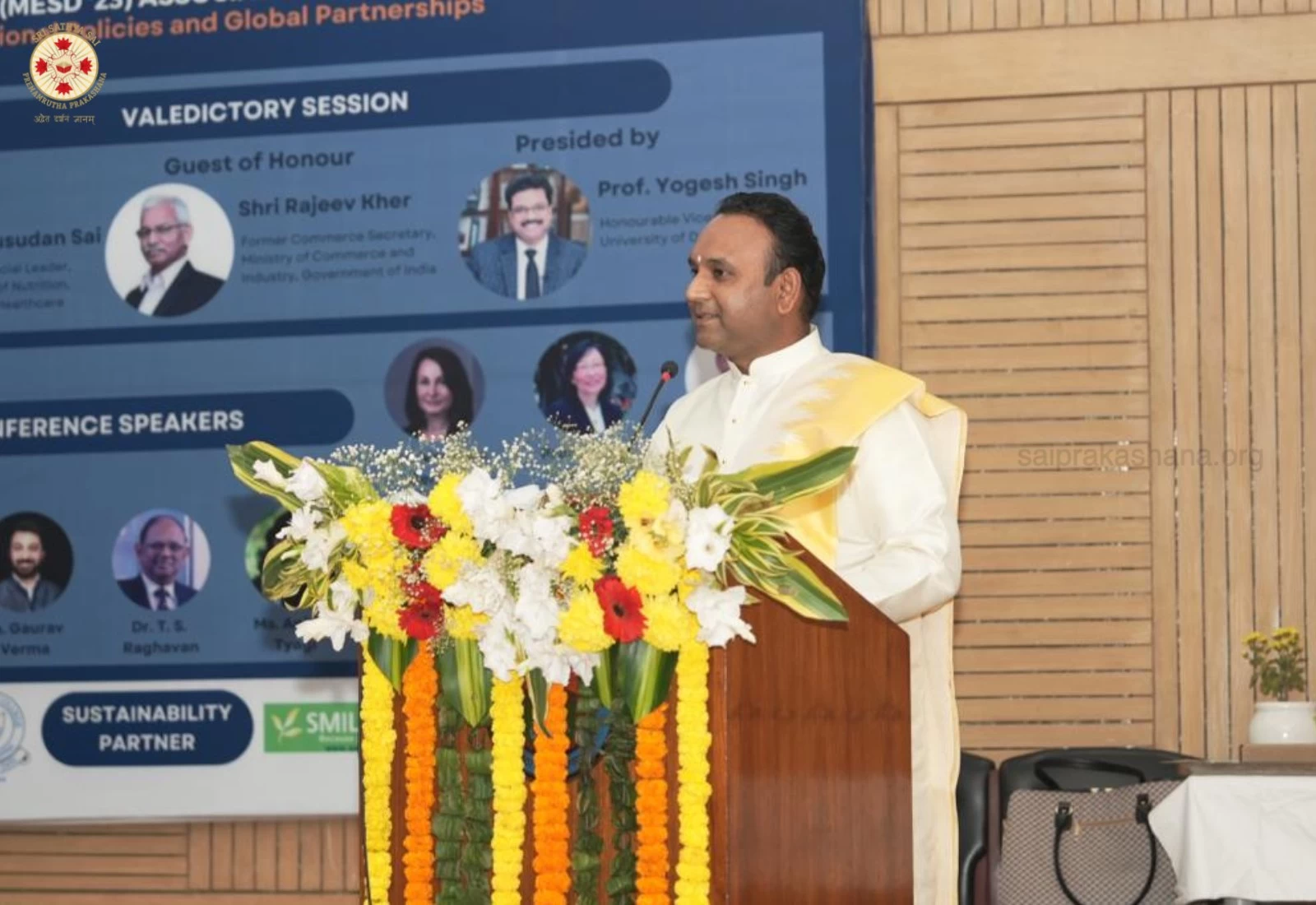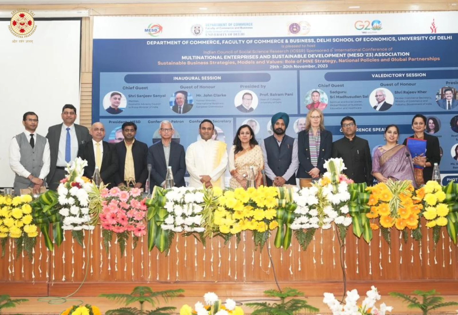 The 6th International Conference of Multinational Enterprise and Sustainable Development (MESD'23) Association, with the theme - Sustainable Business Strategies, Models and Values: Role of MNE Strategy, National Policies and Global Partnerships was held on 29 and 30 November, 2023 at the University of Delhi. It was a brilliant confluence of students, research scholars, policy makers, industry delegates and educators, and this evening, Thursday 30 November, the two-day conference concluded with Sadguru Sri Madhusudan Sai presiding over the Valedictory Session as the Chief Guest. Shri Rajeev Kher, (Former Commerce Secretary, Ministry of Commerce and Industry, Government of India) Dr. S P Sharma (Chief Economist and Deputy Secretary General PHD - Chamber of Commerce and Industry), Prof. Rabi Narayan Kar (Principal, Shyam Lal College - University of Delhi), Prof. Ajay Kumar Singh (Head and Dean Department of Commerce - University of Delhi) and Prof. Niti Bhasin (Department of Commerce - University of Delhi) also shared stage at the Valedictory Session. The event was hosted by the Department of Commerce, Faculty of Commerce and Business, University of Delhi in partnership with Sri Sathya Sai University For Human Excellence, SSSUHE.