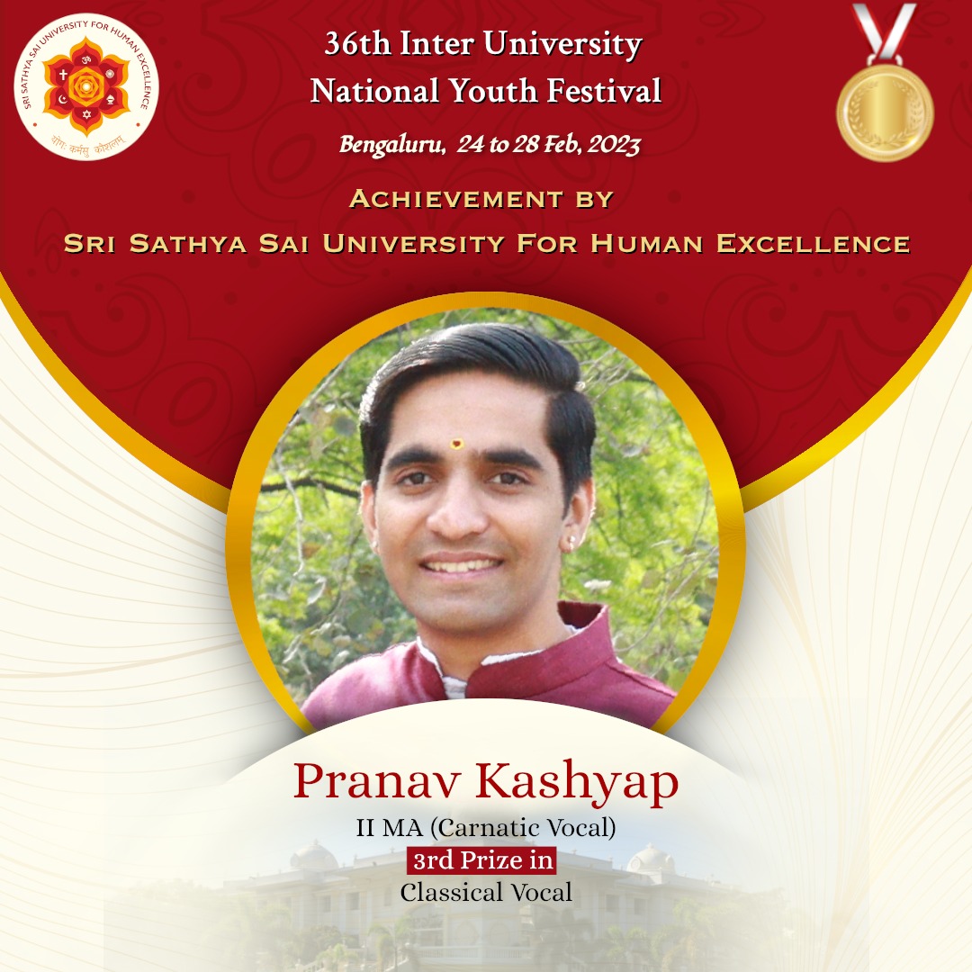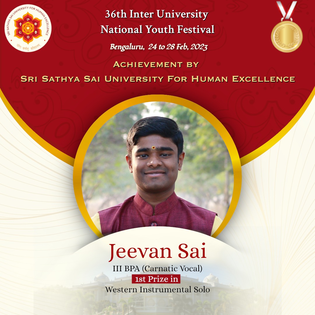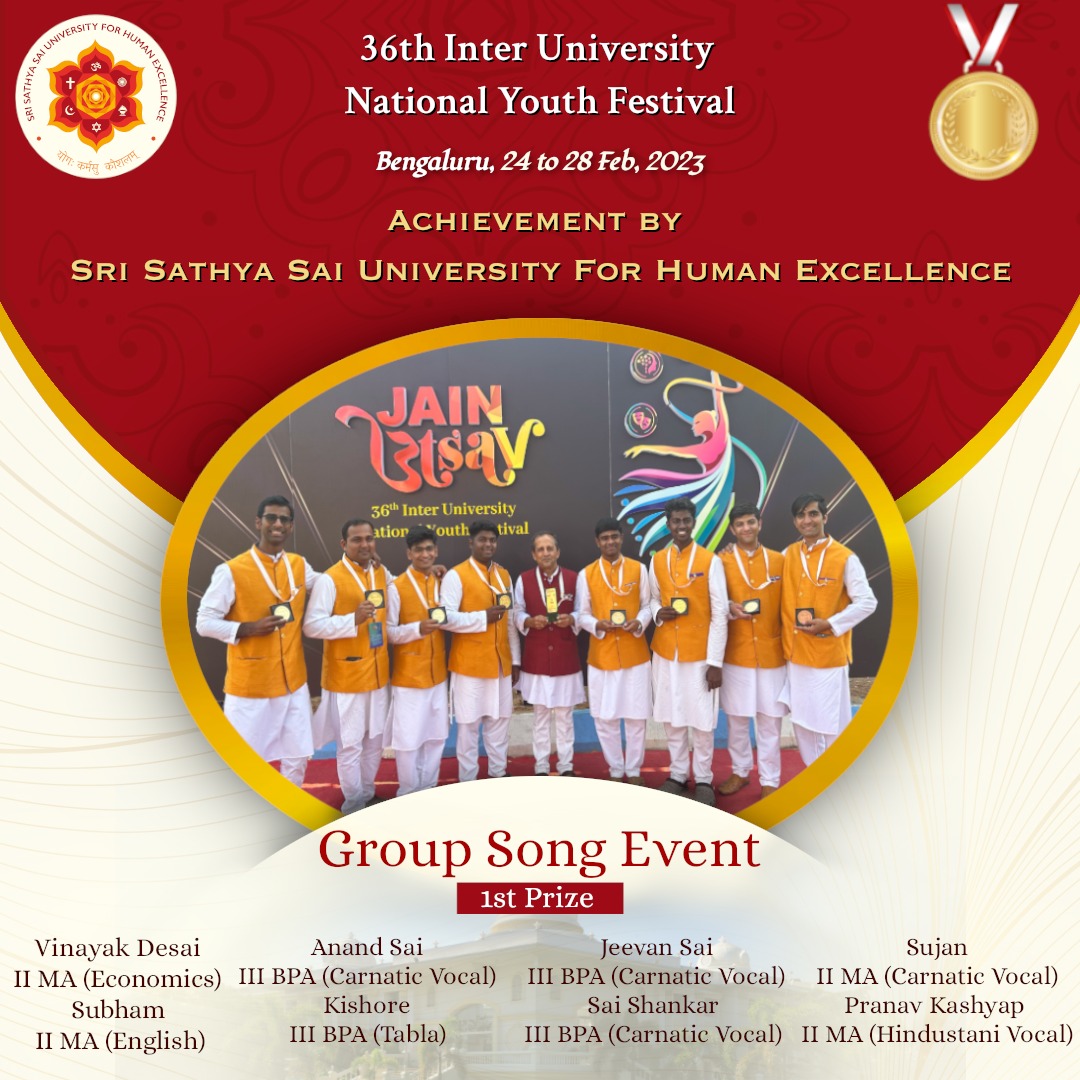 We congratulate the students of Sri Sathya Sai University for Human Excellence (SSSUHE) for their outstanding performance at the National Level Youth Festival organized by the Association of Indian Universities (AIU). They have bagged the Bronze in Classical Hindustani Vocal and Gold in both the Western Instrumental Solo and Indian Group Song categories. Winning the Gold and Bronze medals in different categories is a great achievement and a testament to the hard work and dedication of the students.
