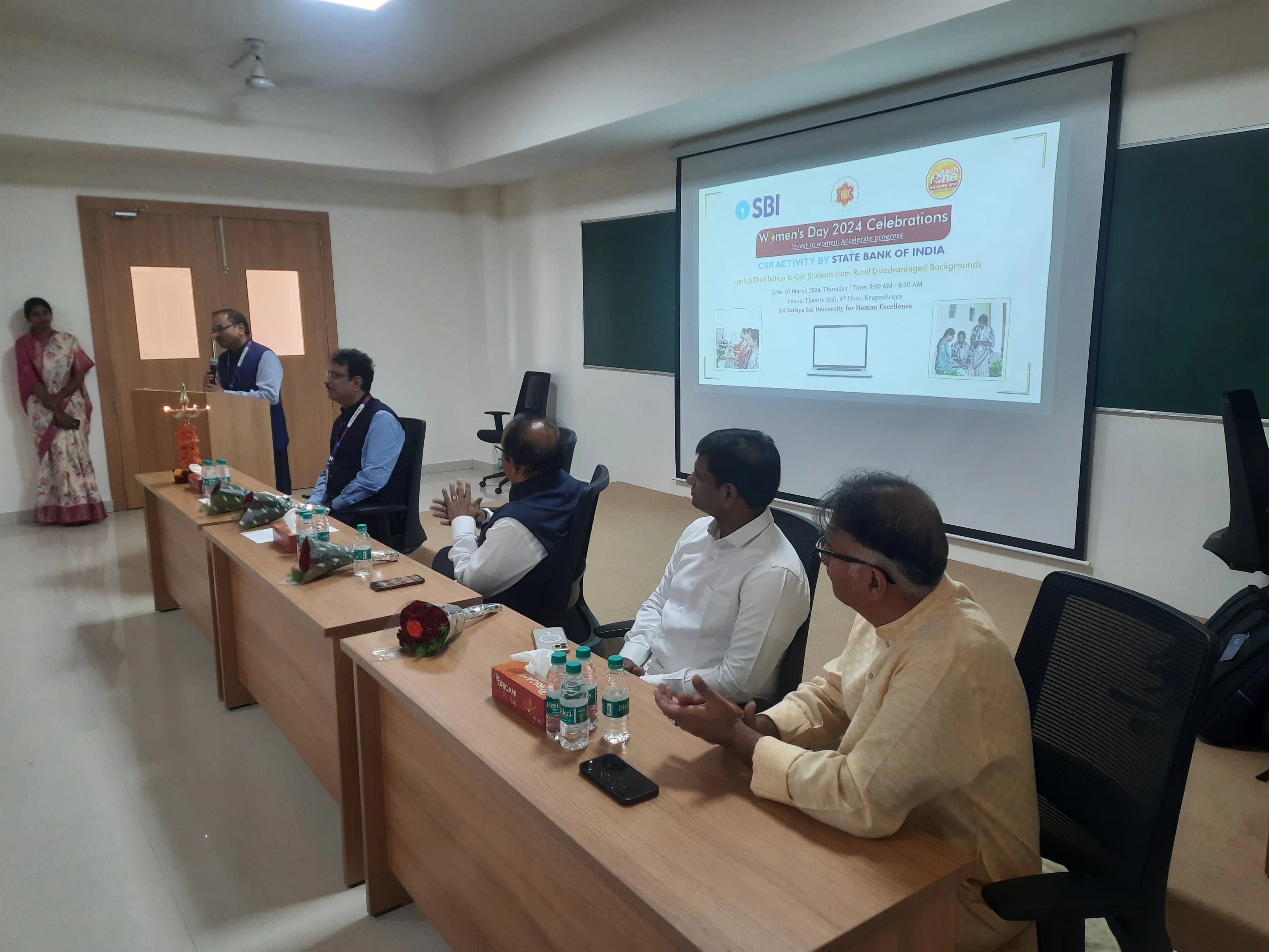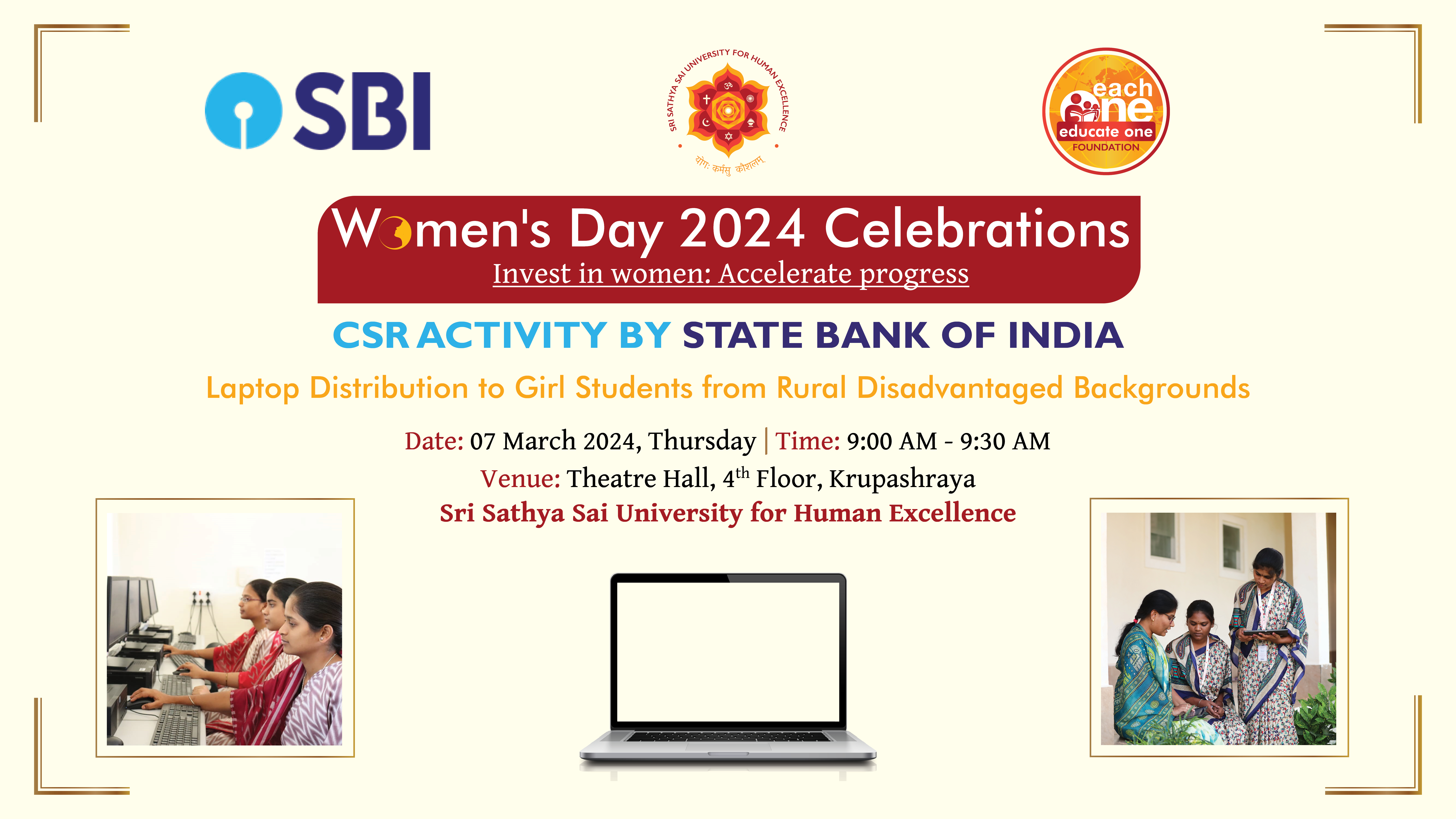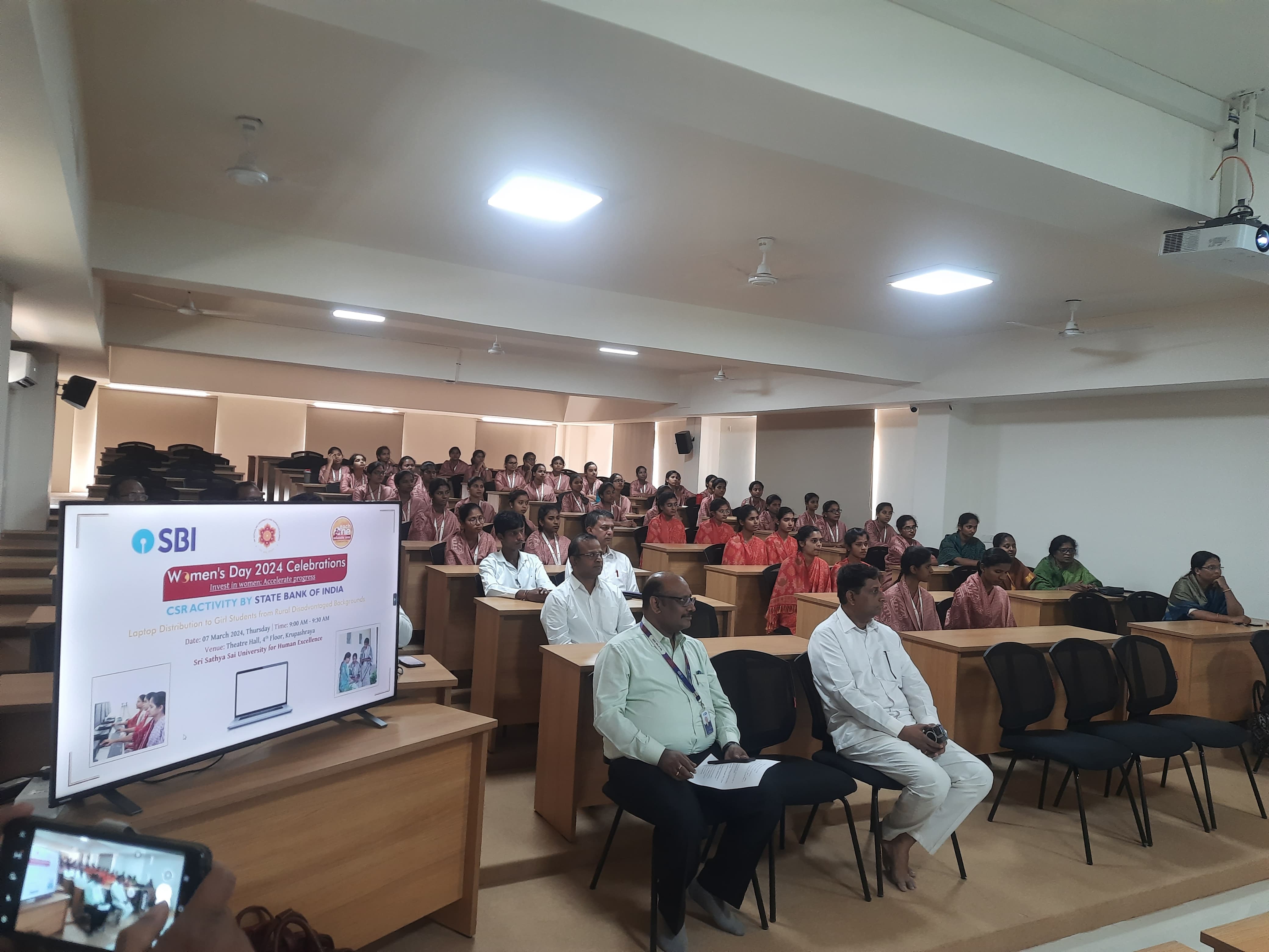 On the 7th of March 2024, Thursday, the Sathya Sai University for Human Excellence (SSSUHE) marked the celebration of Women's Day at the Theatre Hall, 4th Floor, Krupashraya. The event took place from 9:00 AM to 9:30 AM, featuring a significant initiative by the State Bank of India's CSR program – the distribution of laptops to girl students of SSSUHE.