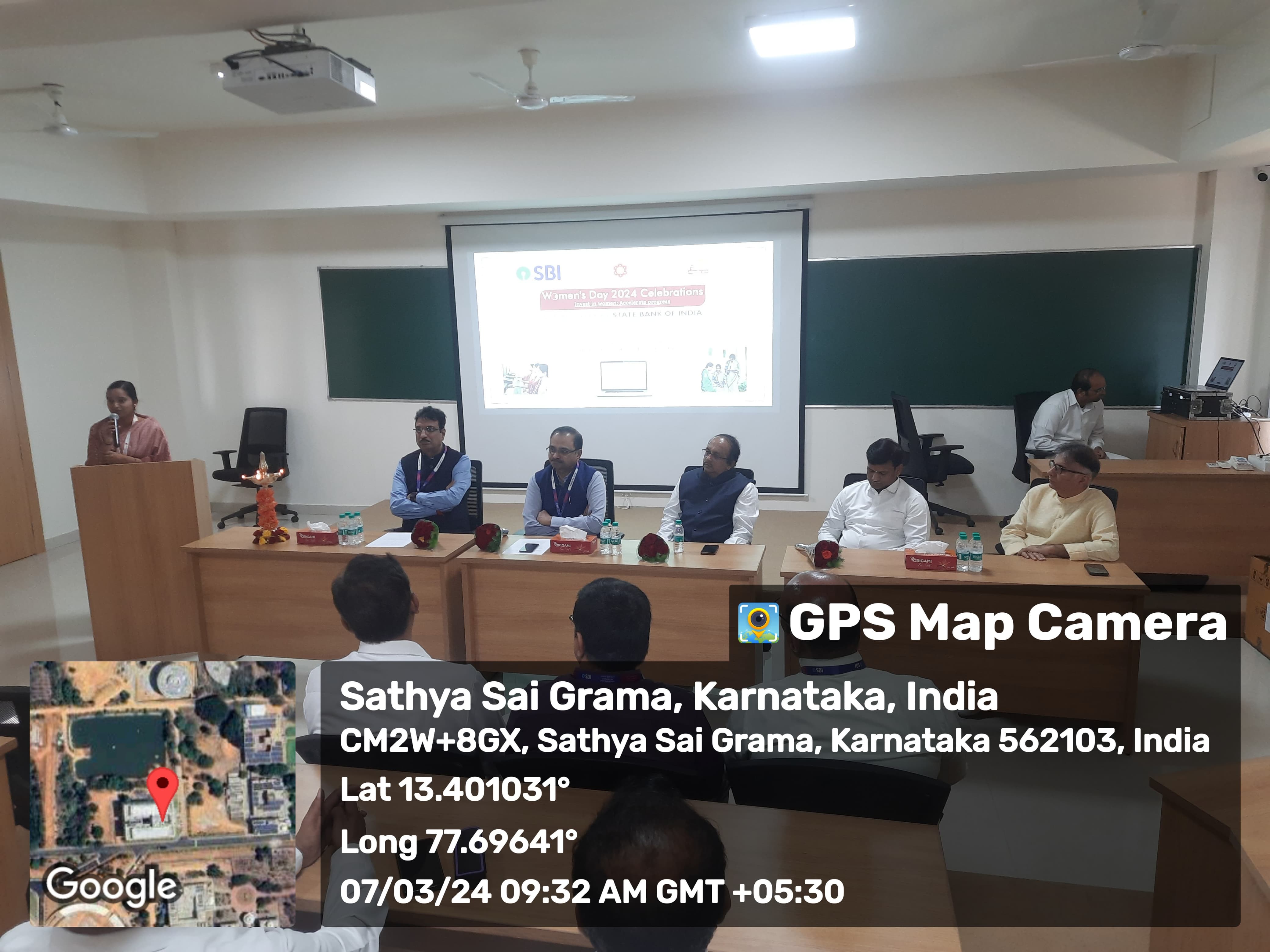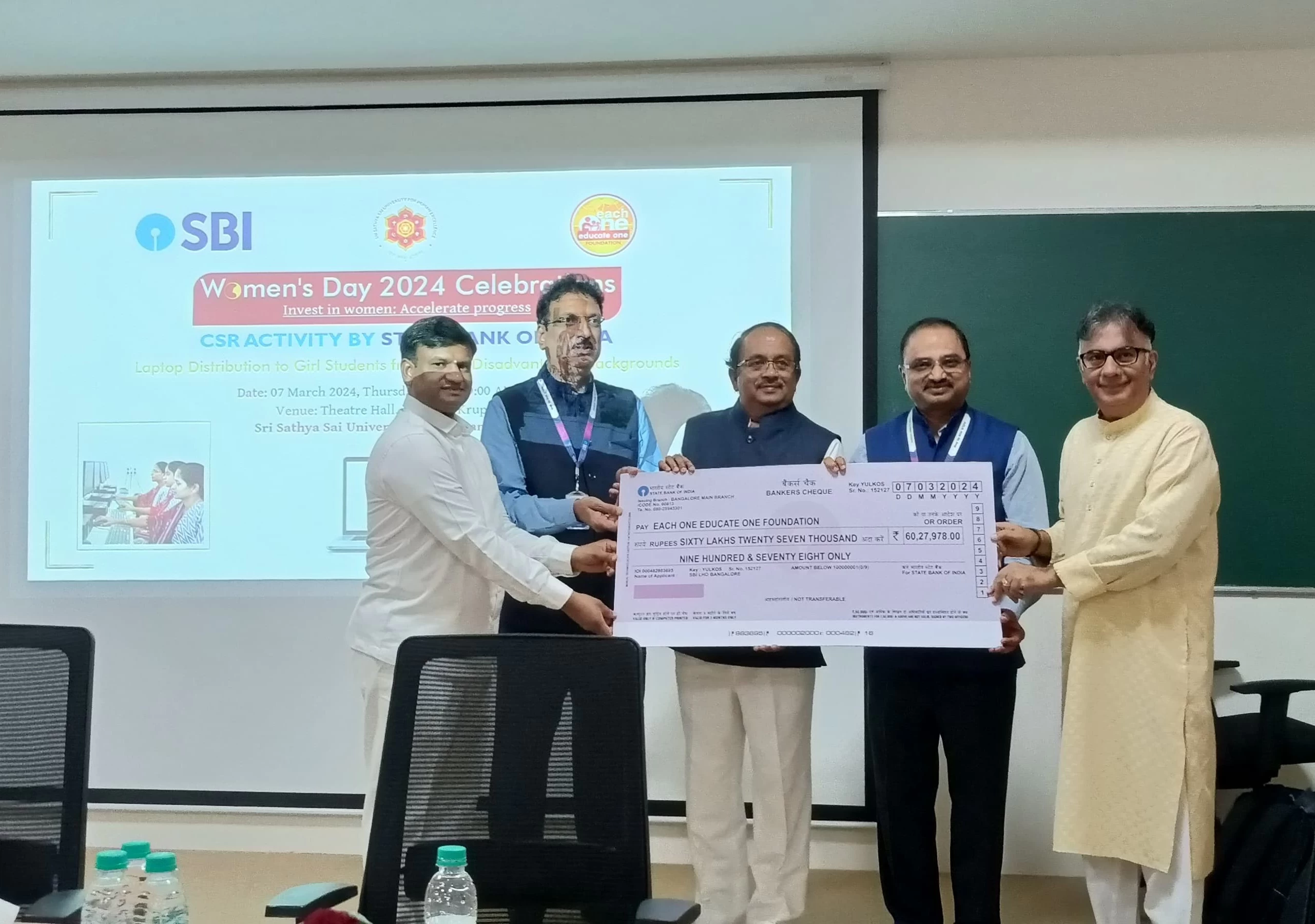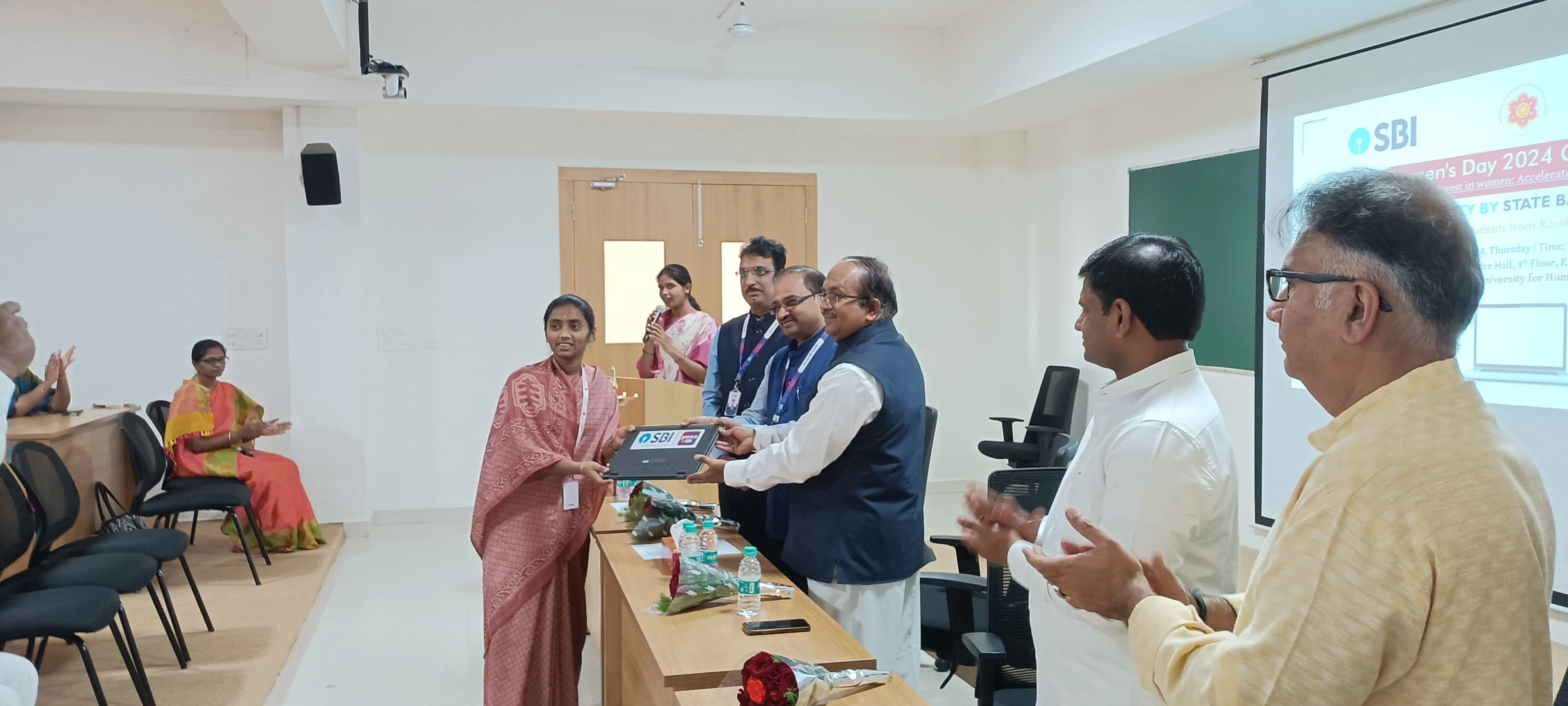 On the 7th of March 2024, Thursday, the Sathya Sai University for Human Excellence (SSSUHE) marked the celebration of Women's Day at the Theatre Hall, 4th Floor, Krupashraya. The event took place from 9:00 AM to 9:30 AM, featuring a significant initiative by the State Bank of India's CSR program – the distribution of laptops to girl students of SSSUHE.