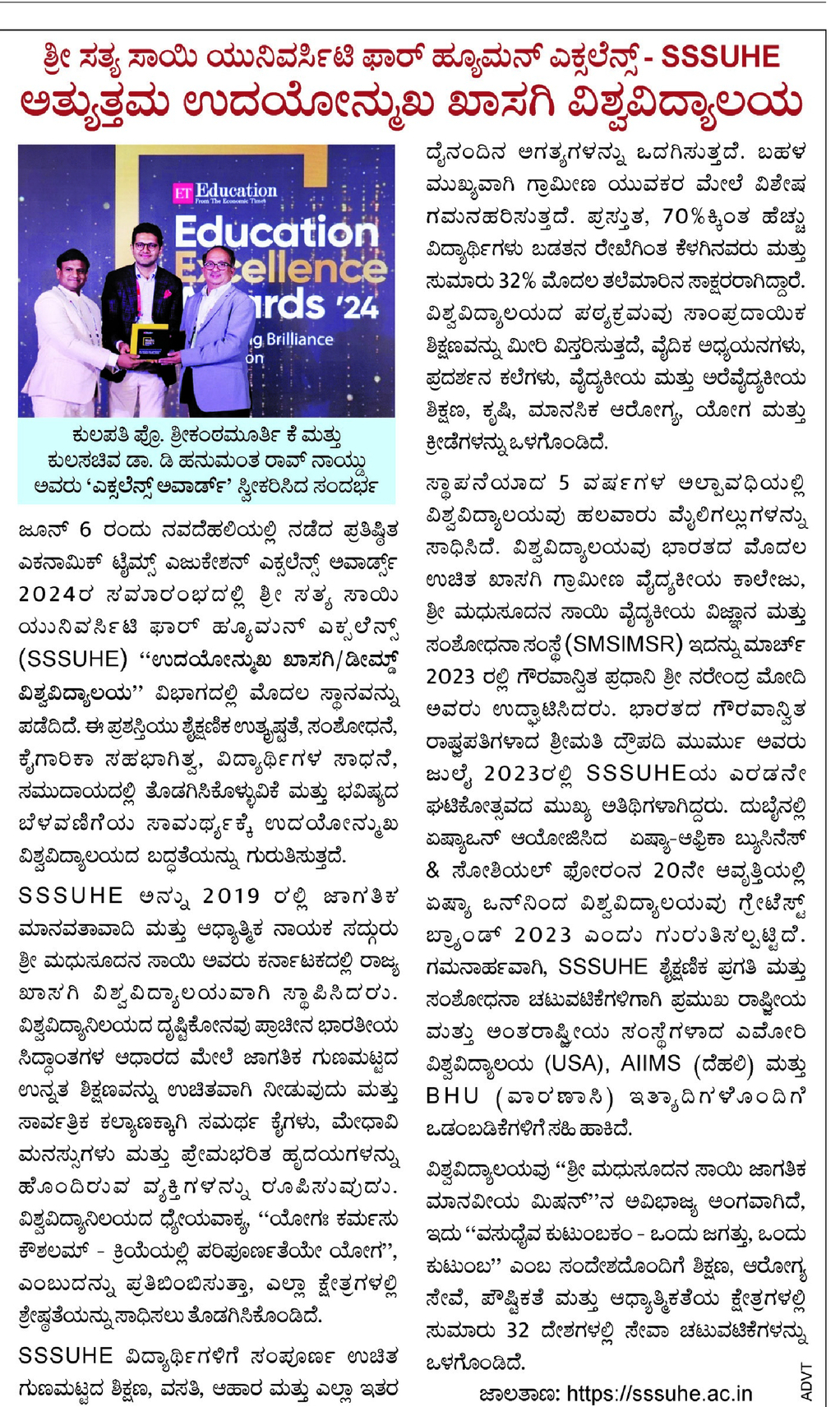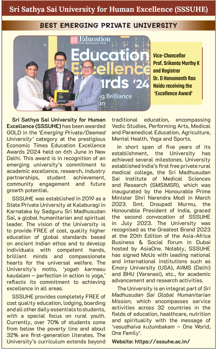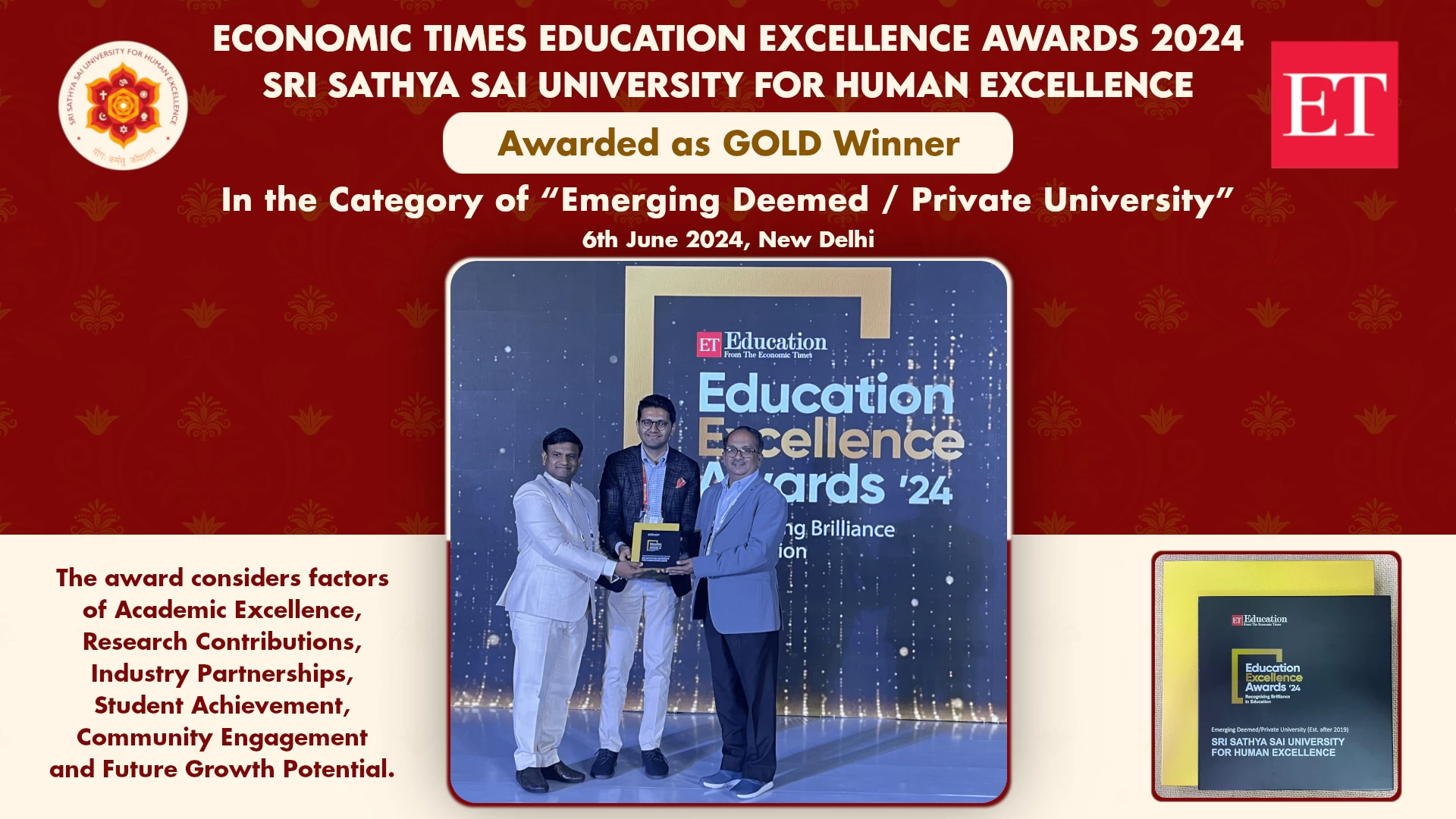 Sri Sathya Sai University for Human Excellence was awarded as GOLD Winner in the Emerging Deemed/Private University category at this awards event in New Delhi.