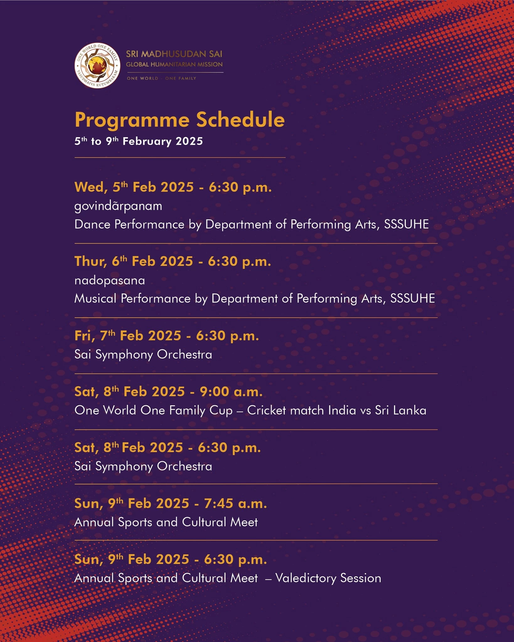 From captivating dance and music performances by SSSUHE to the thrilling One World One Family Cup between India 🇮🇳 and Sri Lanka 🇱🇰, and the much-awaited Annual Sports and Cultural Meet, these days promise to be a true celebration of talent and unity.
